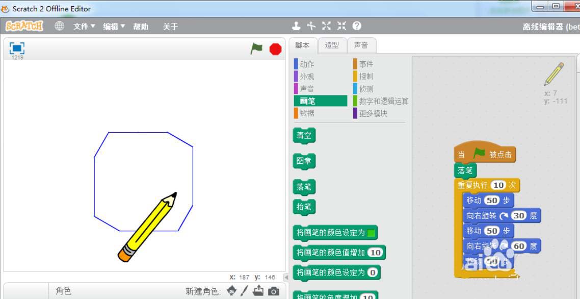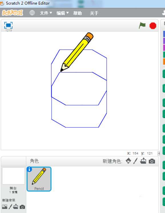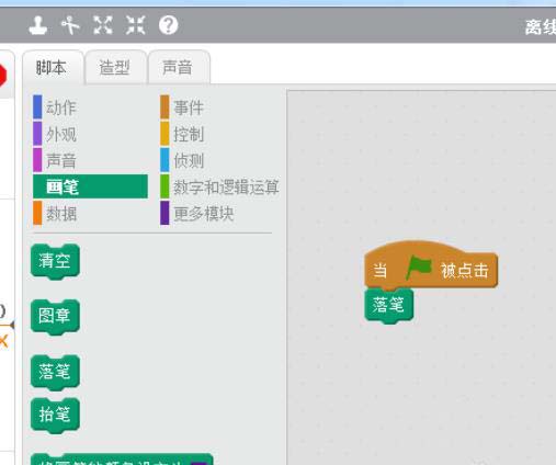 3、导入点击绿旗。画笔。落笔。