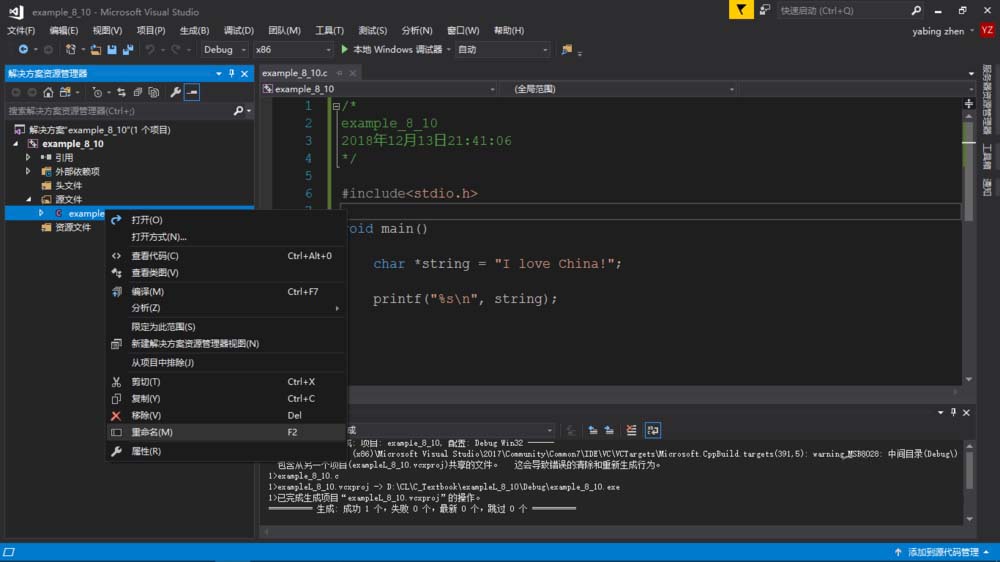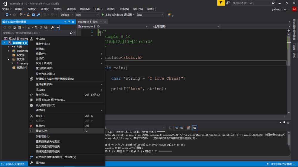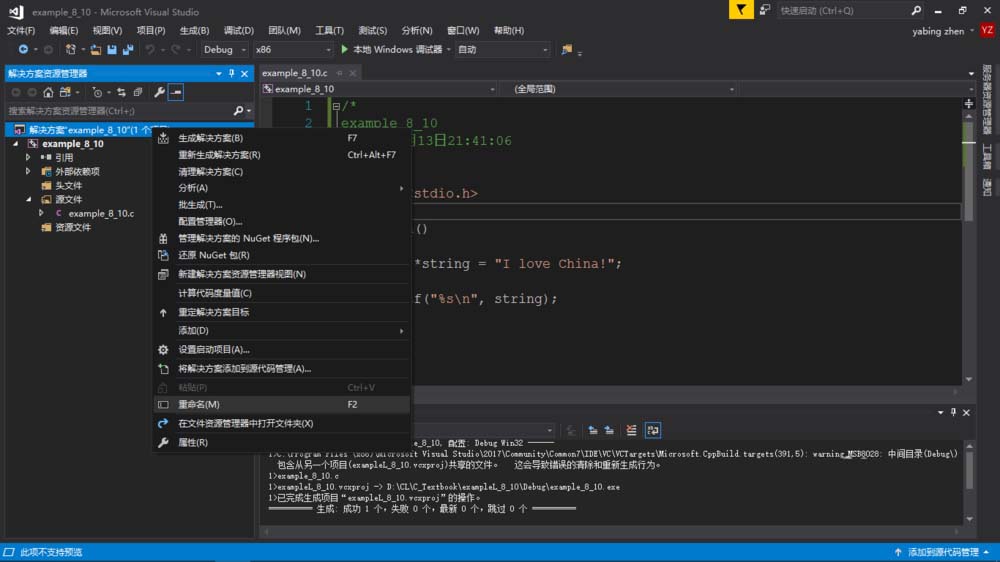 解决方案重命名:鼠标右击解决方案,选择"重命名"。