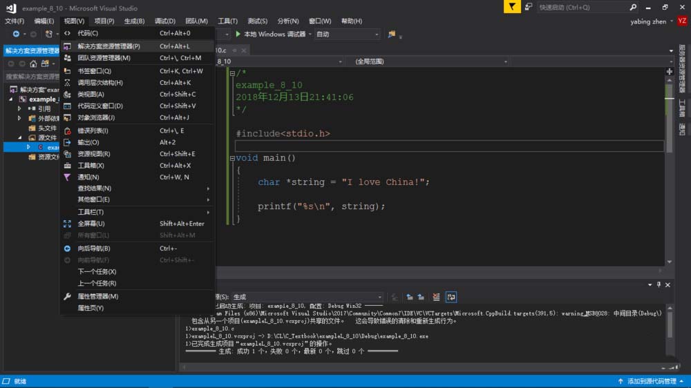 2、在菜单栏中点击"视图",选择"解决方案资源管理器"选项。