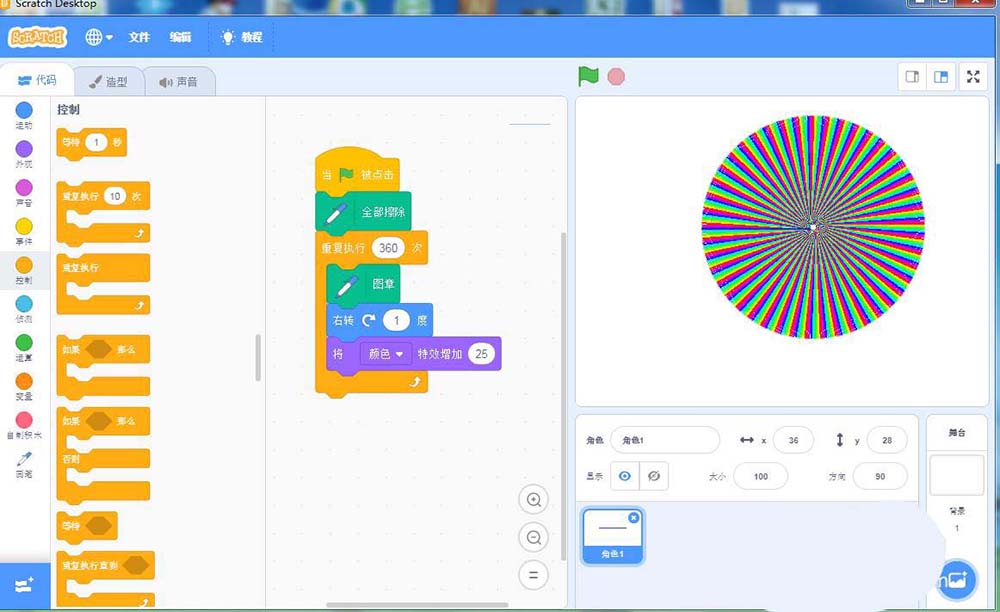 7、点击绿旗执行程序,我们就在scratch3.0中绘制好了一个彩色实心圆。
