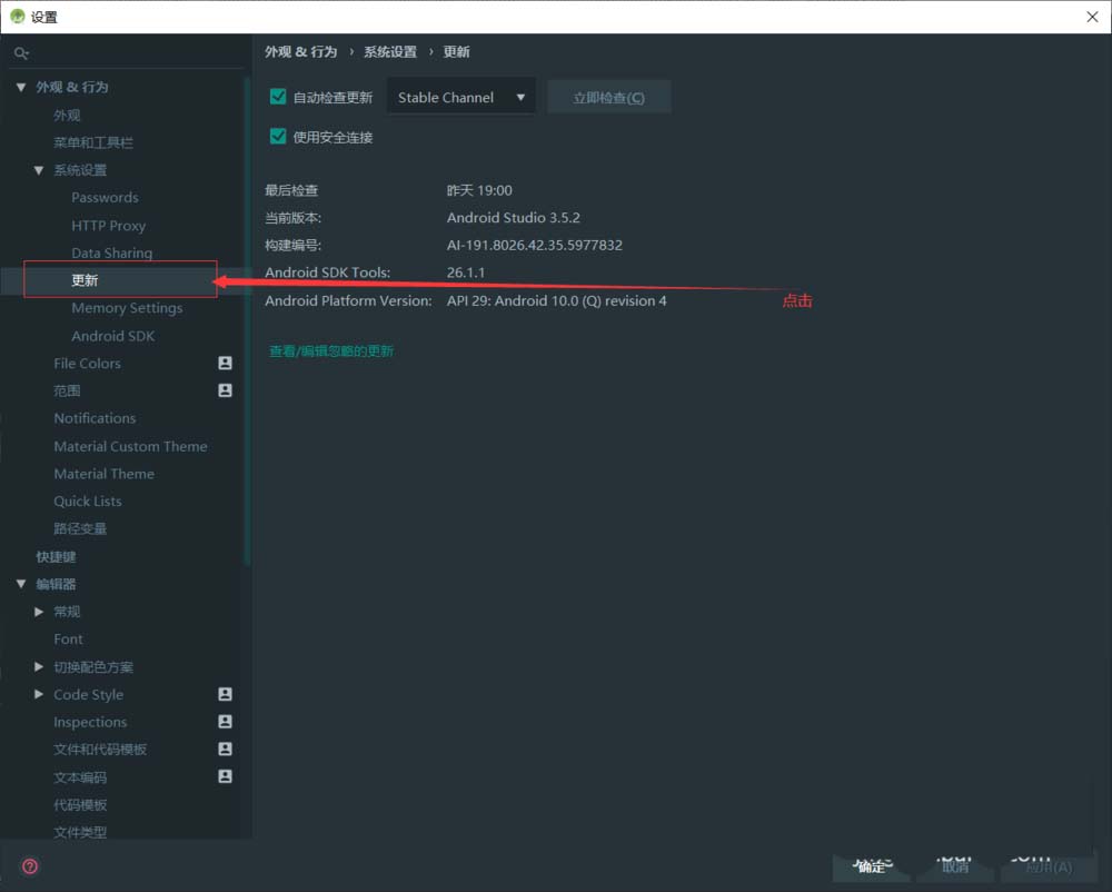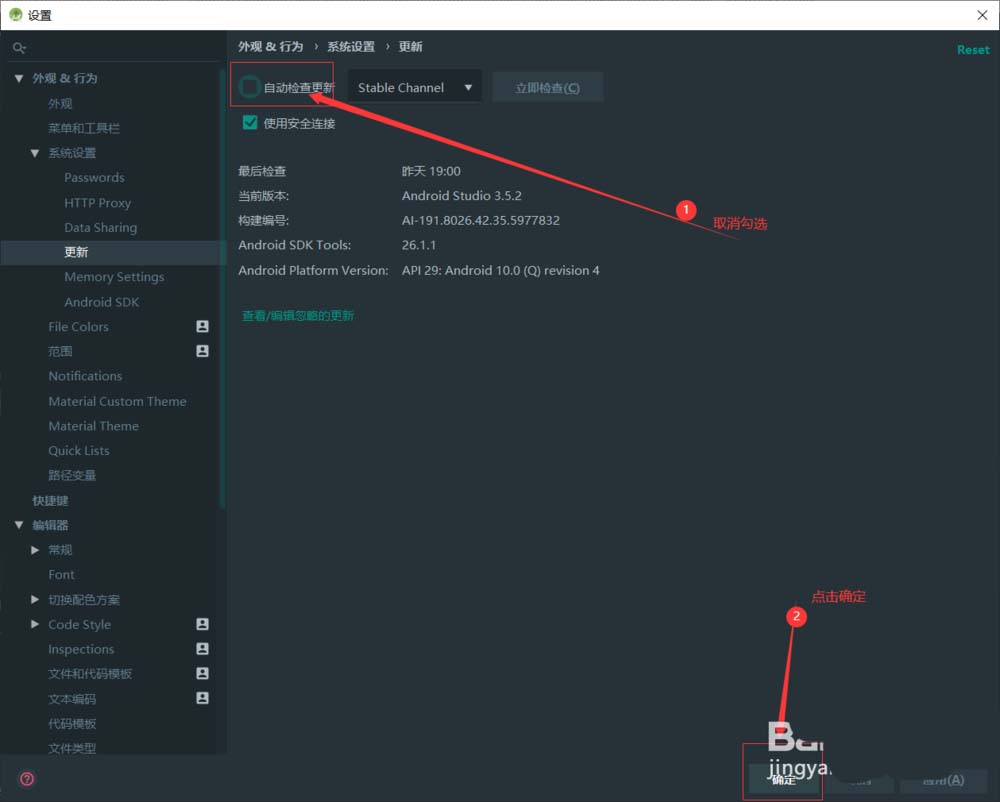 打开Android Studio。打开左上角“文件”-“设置”。点击“外观&行为”。点击“系统设置”。点击“更新”。取消勾选“自动检查更新”,点击确定。