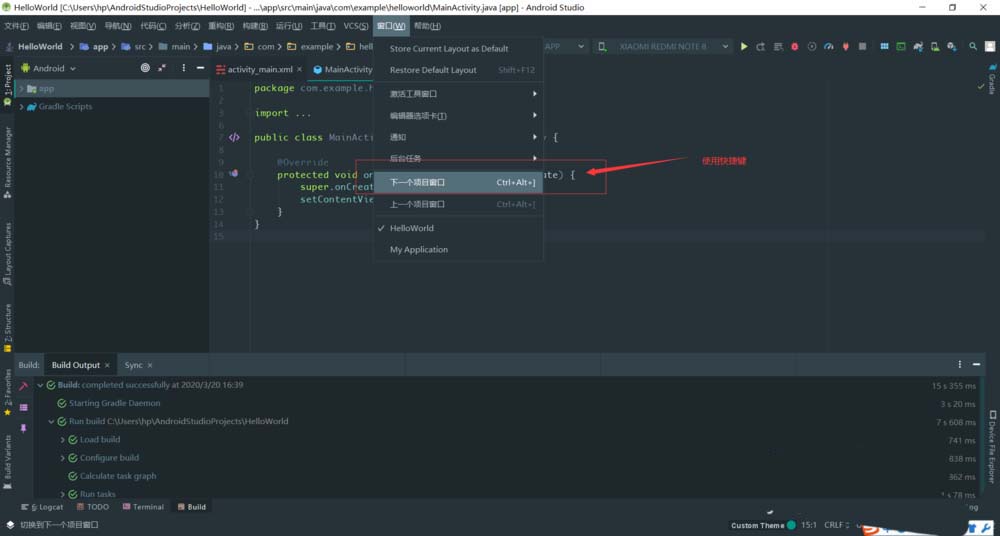打开Android Studio;开一个项目;点击“窗口”,最下一行点击项目,即可切换;使用快捷键“ctrl + alt +[”和“ctrl + alt + ]”快速切换。