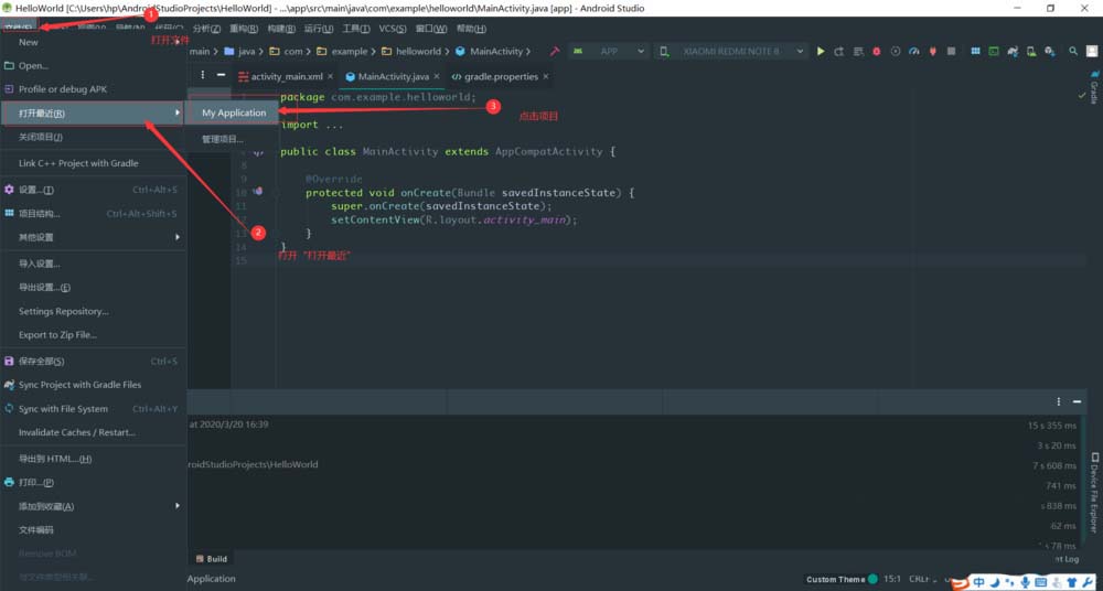 2、我们这里默认打开了上次编辑的项目“HelloWorld”,我们再开一个项目:点击顶部菜单栏“文件”-“打开最近”-“My Application”。