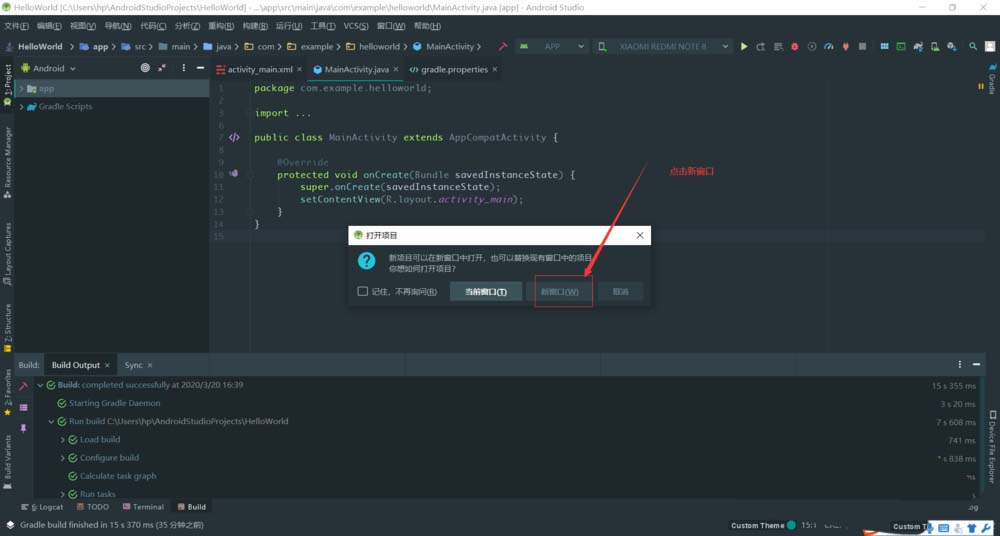 3、弹出的“打开项目”对话框中提示“是否在新窗口打开”,我们点击“新窗口”,就在新窗口打开了。