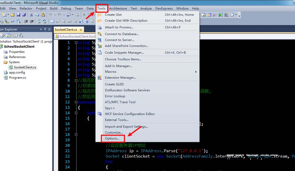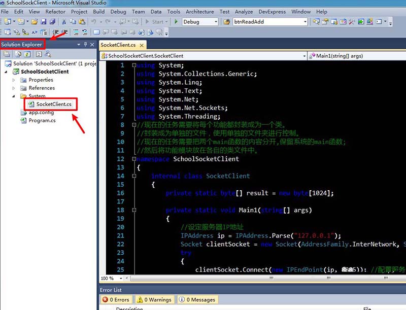 1、在项目解决方案资源管理器“Solution Explorer”中双击打开“SocketClient.cs”文件。