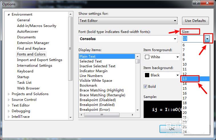 6、在Size字体大小位置处点击下拉菜单,选择13号字体大小。
