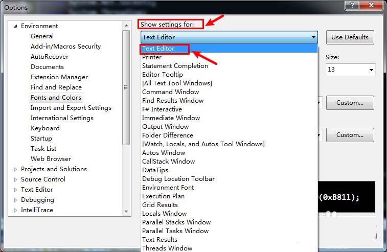 4、点击“Show setting for”下拉菜单,在菜单中选择“Text Editor”即设置字体应用范围为文本编辑器。
