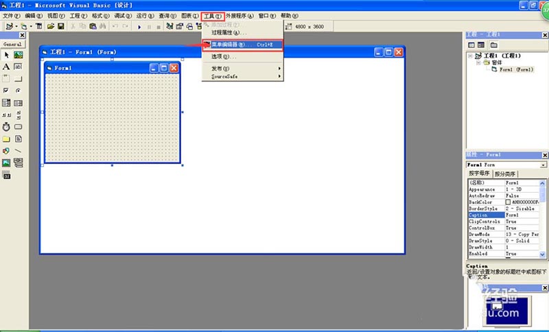 2、在VB的顶部找到“工具”>“菜单编辑器”。或者,按下键盘上的“Ctrl+E”也行