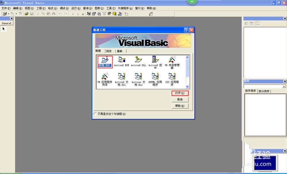 1、首先打开VB,并且选定“标准 EXE”来新建一个工程