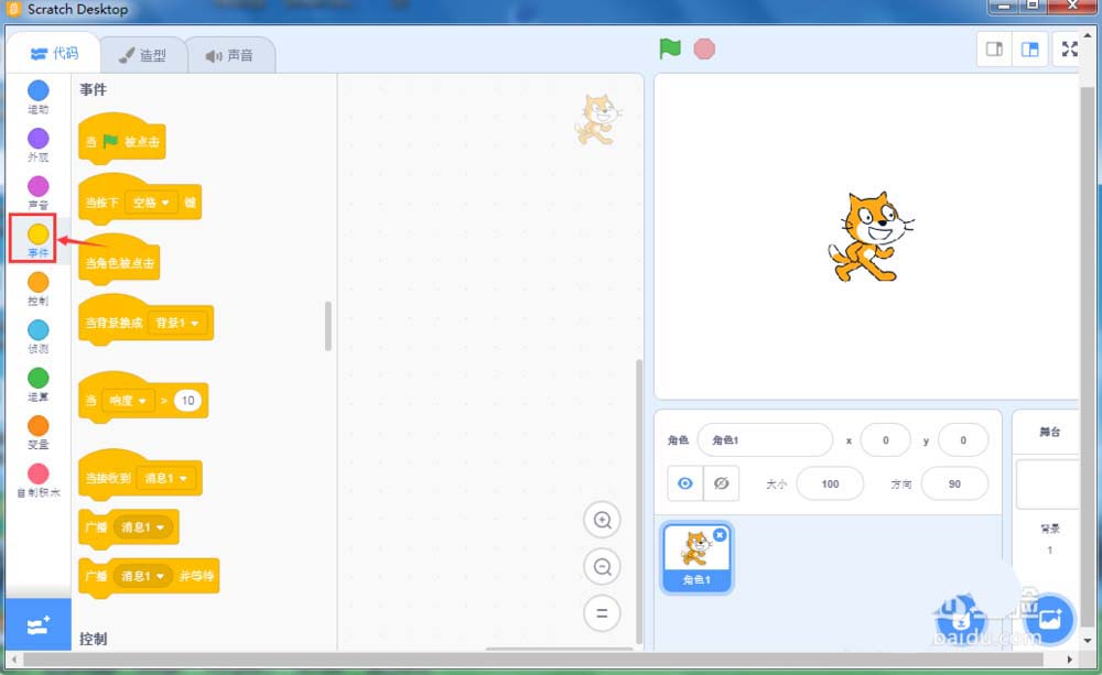 3、添加当绿旗被点击命令到脚本编辑区中;;