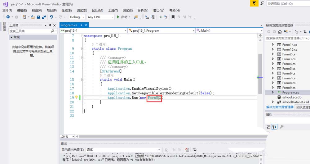 6、将Form1改为Form5,运行结果如下,可见起始页改变成功。