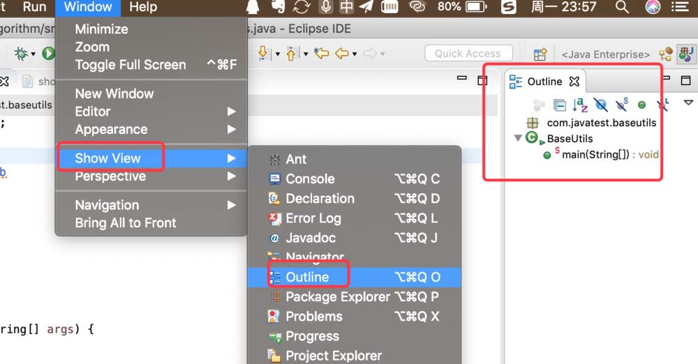 PS:还可以调出outline窗口来快速查看当前类的所有方法和成员变量,这也是非常便捷,有利于提高开发效率的工具窗口。