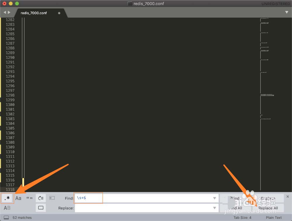 9、然后在find框里面输入/s+$,并点击前面的*好,然后点击下面的replace all