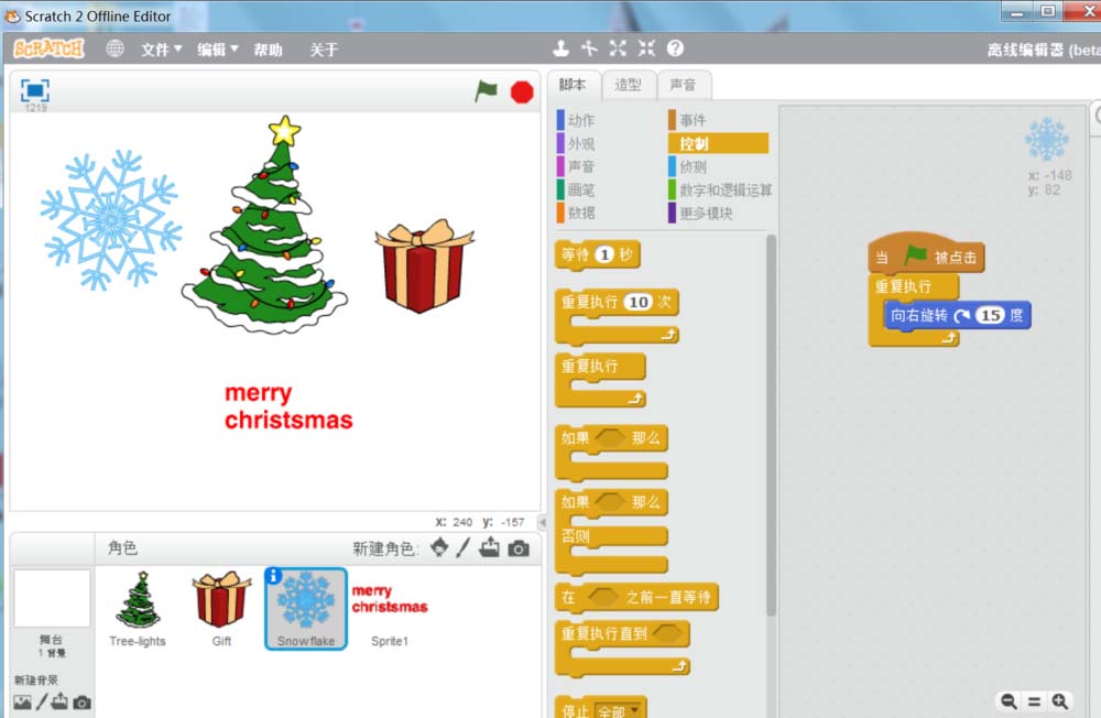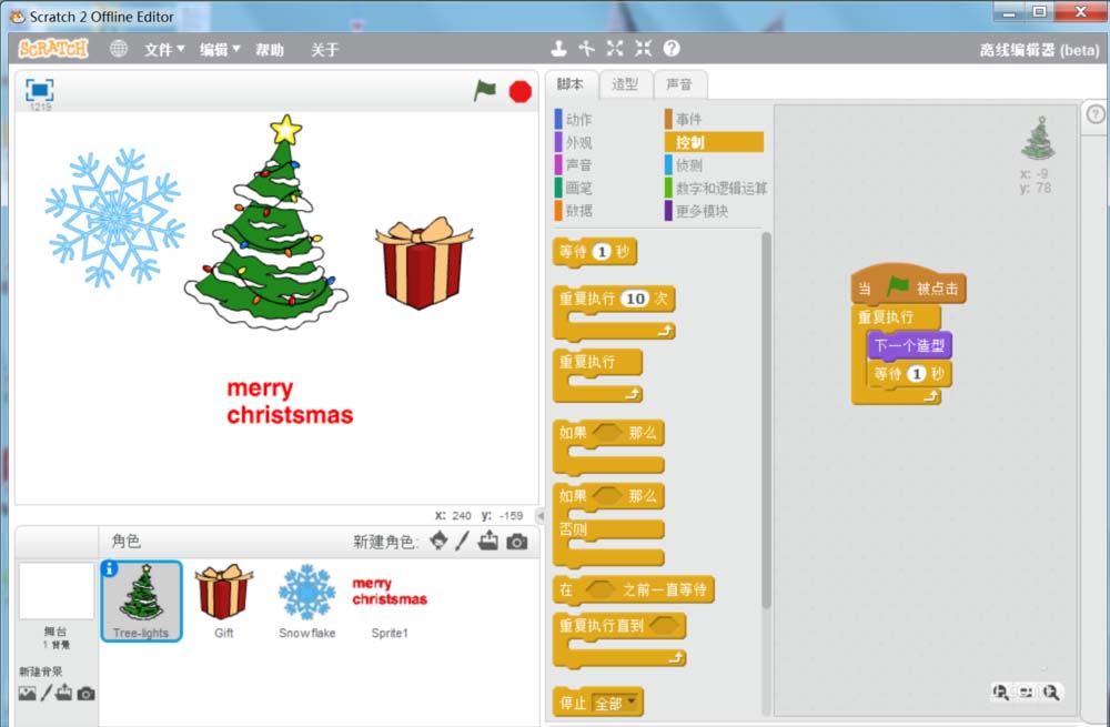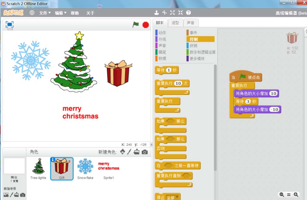 以上就是scratch制作一个圣诞快乐的小程序的教程,希望大家喜欢,请继续关注武林网。