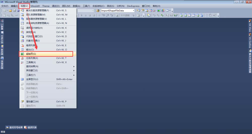 3、打开Visual Studio 2010后,首先点击顶部菜单栏的【视图】,再点击【起始页】,打开起始页面。