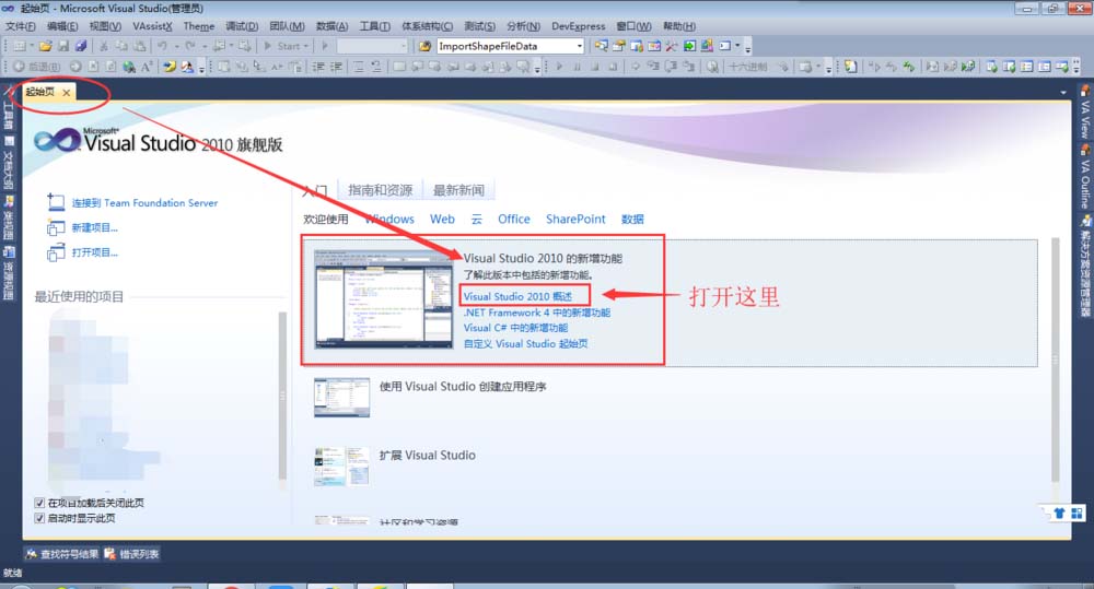 4、然后我们看到如图所示的起始页面,之后点击Visual Studio 2010中的新功能,点击【Visual Studio 2010 概述】即可。