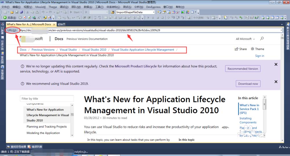 6、当然,除了可以在软件里面直接看到Visual Studio 2010与以往各个版本的区别,还可以在URL的地方复制地址,粘贴到浏览器中查看,翻译成中文更方便查看。