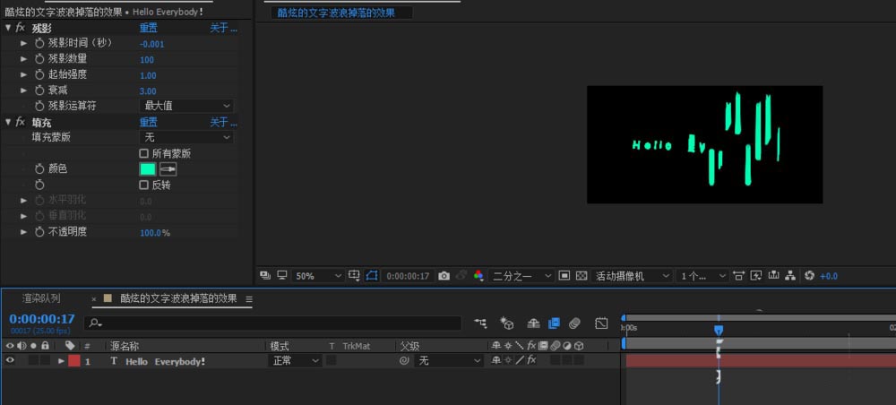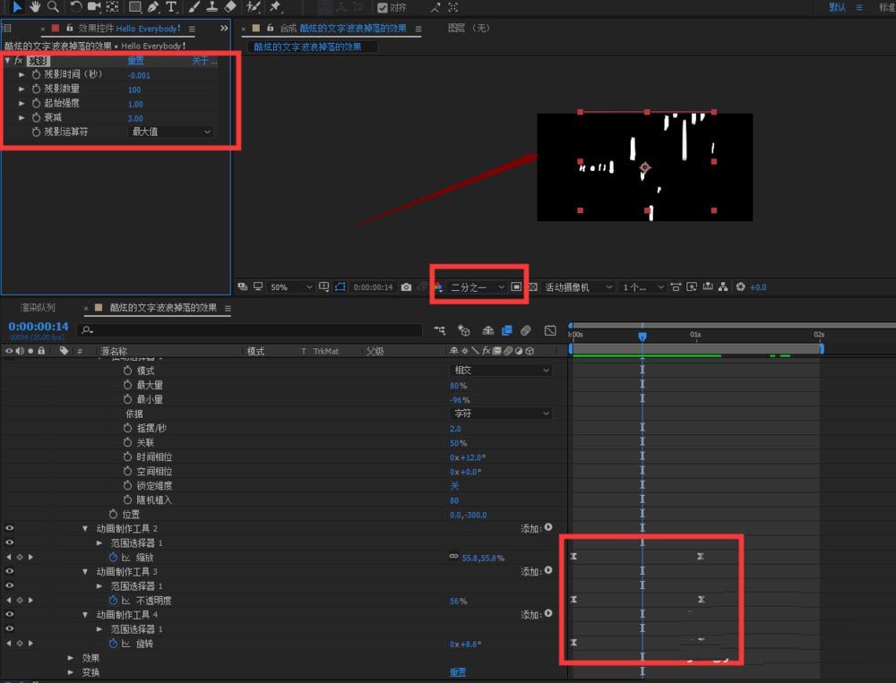 2、我们在前面的趣味性的效果下想要让他更加的酷炫的话,我们可以给文字添加一个残影; 添加之后可以看到有一些残影的感觉在动画里面;设置残影的参数,可以看到我们得到一个十分有趣且有内涵的动画;如果预览起来会比较卡的话,可以把分辨率降低到二分之一,进行效果的预览;