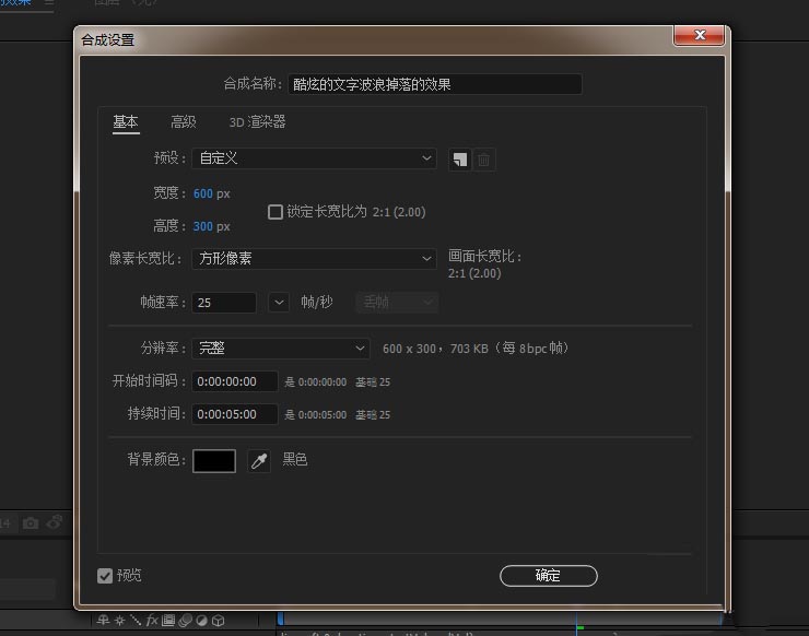 1、打开AE软件,新建合成,命名酷炫的文字波浪掉落的效果,调整相应的参数。