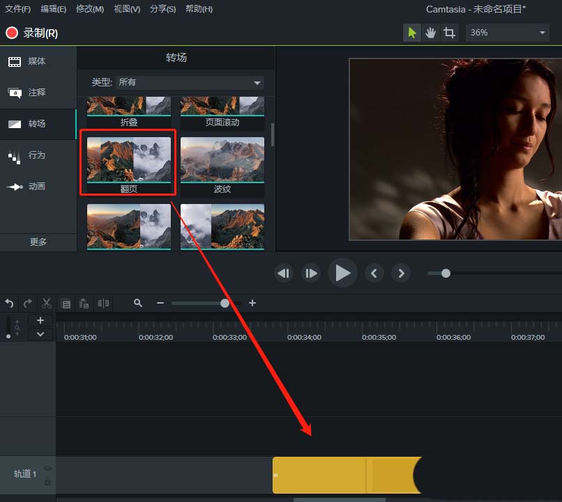 5、单击展开转场选项,在转场中找到“翻页”这个转场效果,选中拖动到两个视频中间。