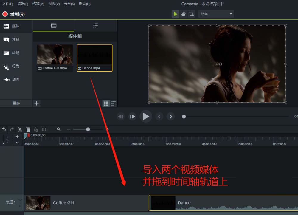 3、执行导入媒体之后,会弹出打开一个对话窗口,选两个视频素材导入到Camtasia 9,并将视频素材拖到时间轴的轨道上。