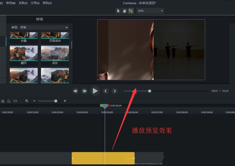 6、让时间轴在过渡转场的位置处播放,进行效果的预览,然后就能看到一个翻页的过渡转场效果。
