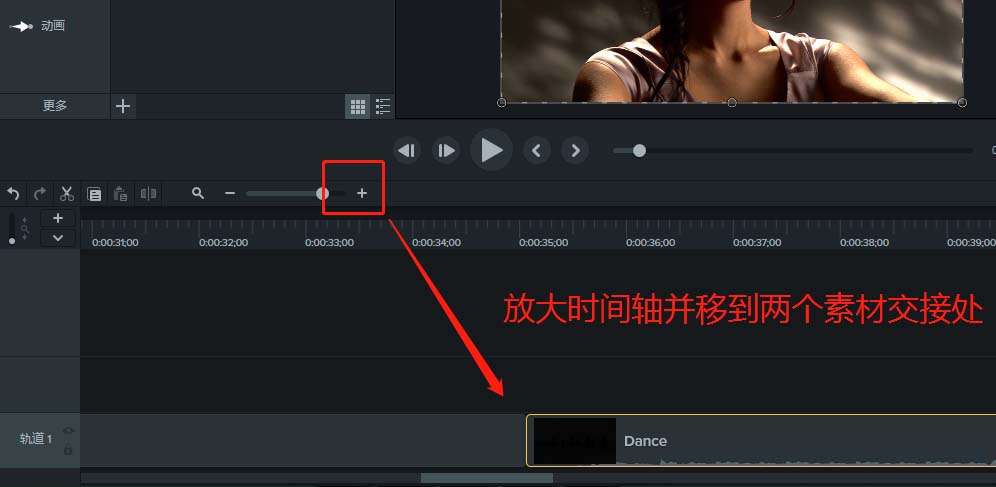 4、点击放大时间轴按钮,就是那个“+”号的标志,放大时间轴,然后移动时间轴位置到两个视频素材相接的地方。
