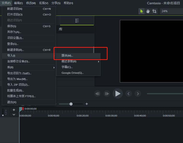 2、点击展开文件菜单栏,选择文件菜单栏中的导入命令,选择导入媒体。