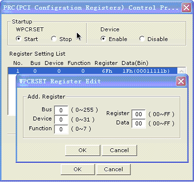 首先我们将选择Strat按钮,表示每次启动系统,自动加载对寄存器的修改。Stop表示不加载设置。Device设置为Enable。修改完毕的寄存器设置会自动出现的修改列表里,也可以点击Add按钮,按照Bus、Device、Funtion、Register(即寄存器offset)、data(修改后的数值)等方面来手工添加。Edit按钮可以对已经存在的寄存器修改数值进行编辑,Del则可以进行删除,使用非常的方便。