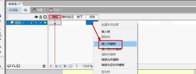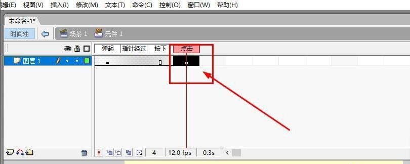 6、这时可以看到时间轴变成4个帧,前三个帧分别是弹起,鼠标经过及按下,最后一个帧是点击,也就是点击区域,在第4帧插入关键帧