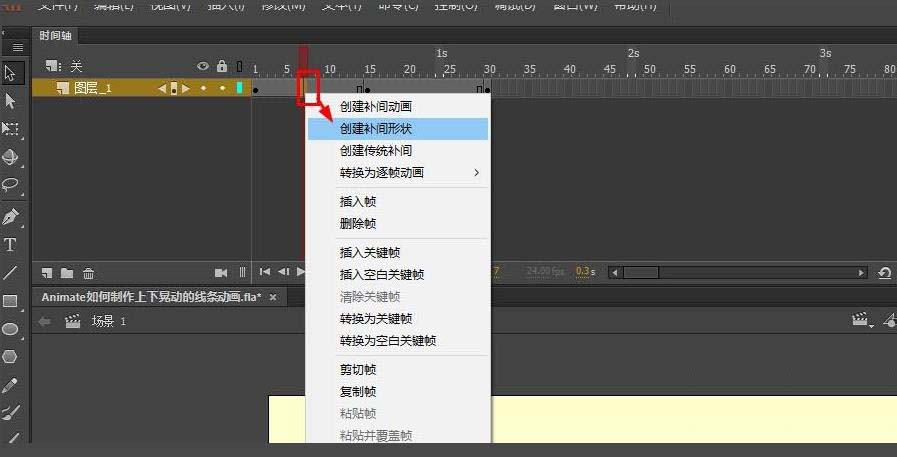5、在1-15,15-30帧之间创建补间形状动画