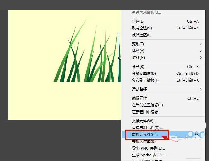 2、以一个草叶为例,选择一个草叶,因为这里准备的草叶都是单独的元件了,只要转换一次元件即可。
