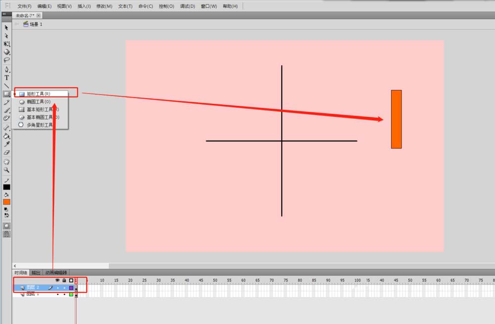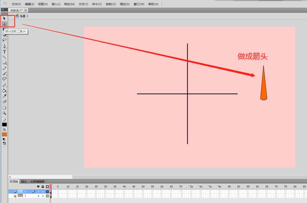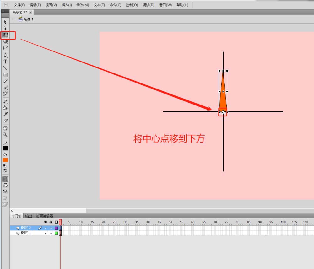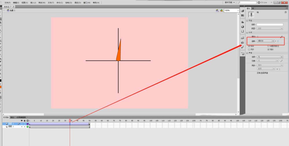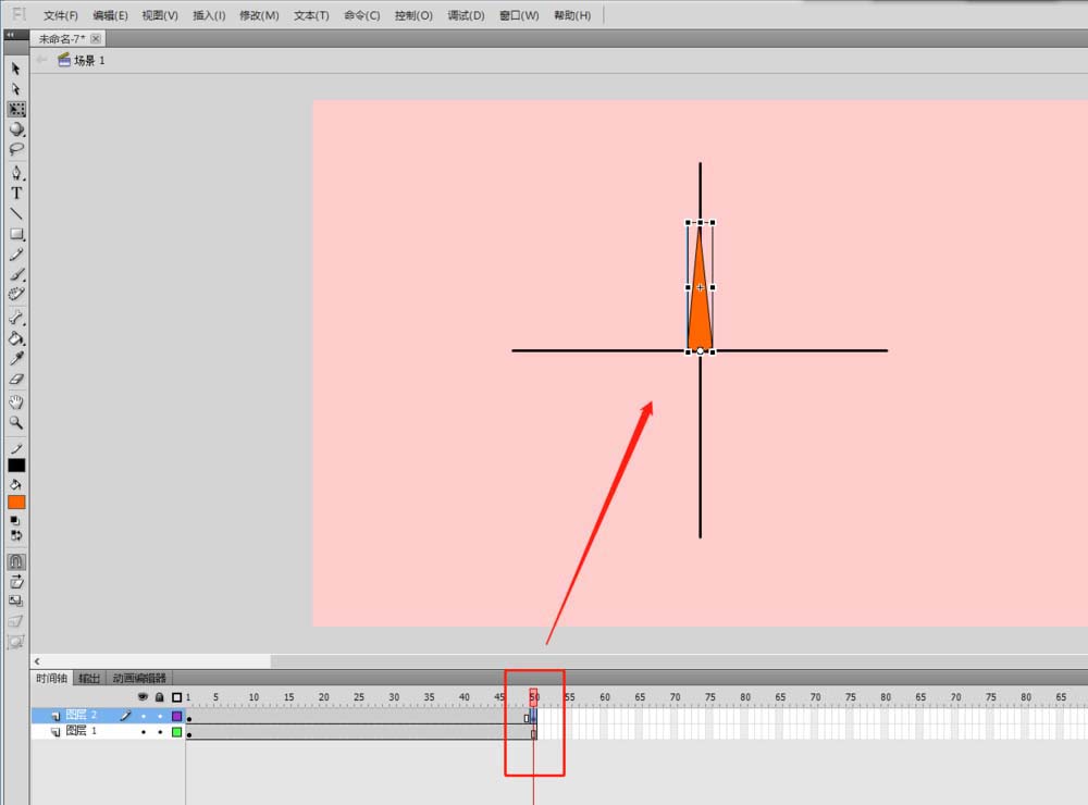 6、移动箭头到十字中心位置,并选择任意变形工具将箭头变换的中心点移到下方;然后在图层2即箭头的第50帧插入关键帧;图层1键十字线条的第50帧插入普通帧。