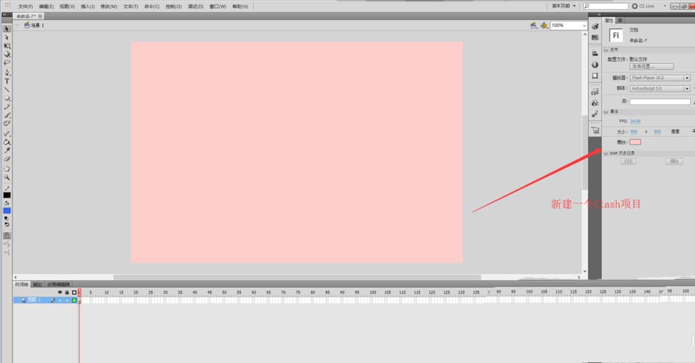 1、打开flash软件并创建一个项目,在属性面板中设置好有关这个flash项目的必要参数属性。