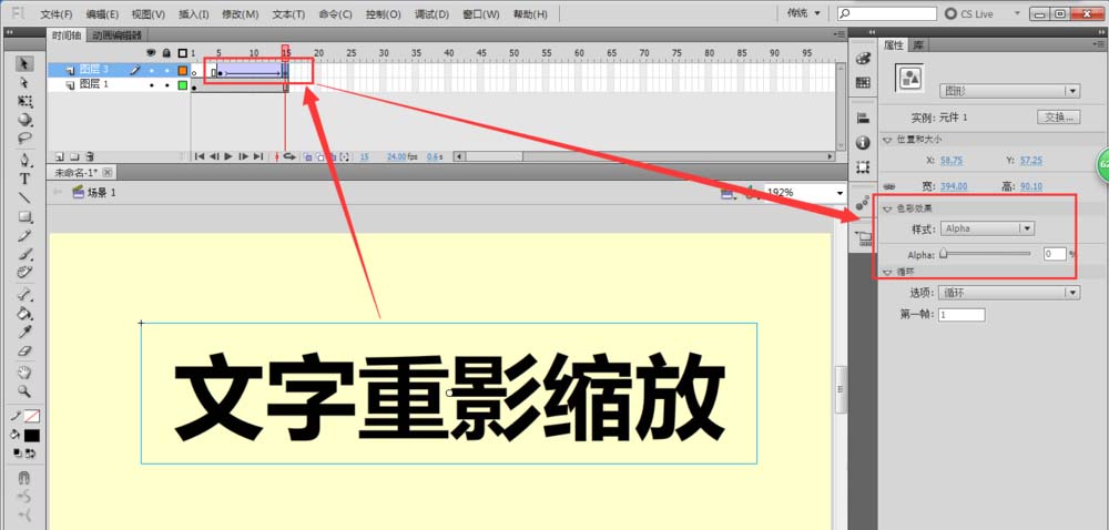 5、选中图层2的第15关键帧,在属性中将其alpha数值改为0,并且在图层2两个关键帧之间来创建传统补间动画。