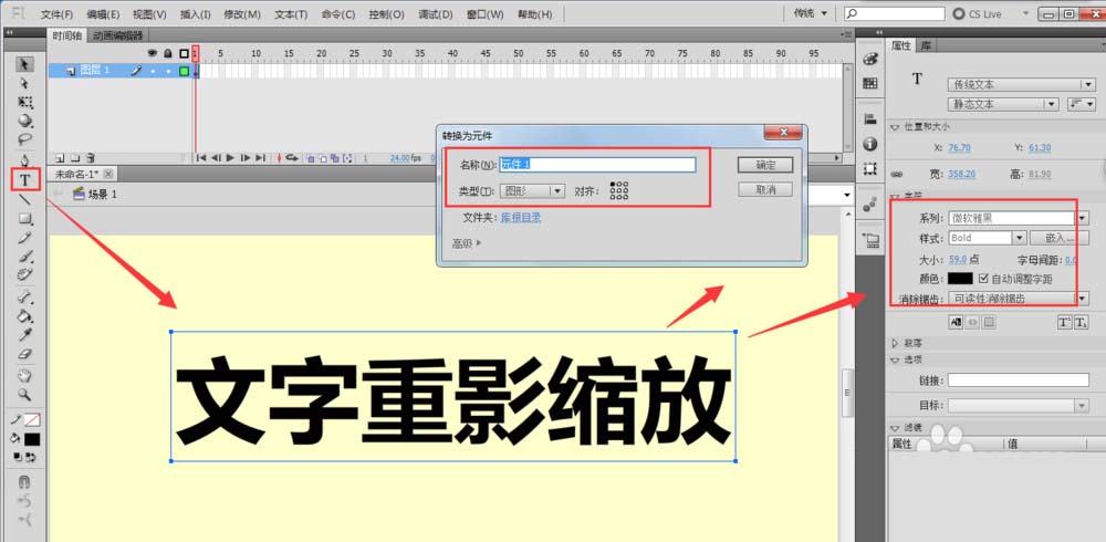 2、使用文本工具在舞台上输入文字,并在属性面板中设置文字的属性,然后选中文字按F8将其转换一个图形元件。