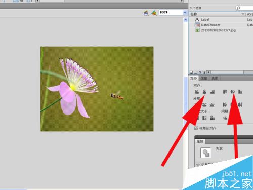 选择舞台中的label组件,在属性面板中设置宽度为220,并在组件检测器中将text修改为请选择日期。