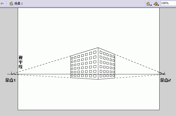 14、 动画中的背景往往并不是单独物体的出现。其他的楼房应该怎么样做呢?绘制的方法是一样,都是利用视平线、余点来完成的。如图13所示: