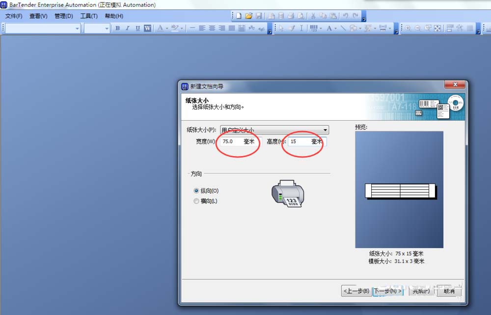 5、在“纸张大小页面”,我们根据实际测量的尺寸,输入纸张宽度和高度,这里实际测量为宽75毫米,高15毫米,我们就在宽度处输入75,在高度处输入15。在下面的方向处选择“纵向”,点击下一步,进入“打印的项目形状”页面。