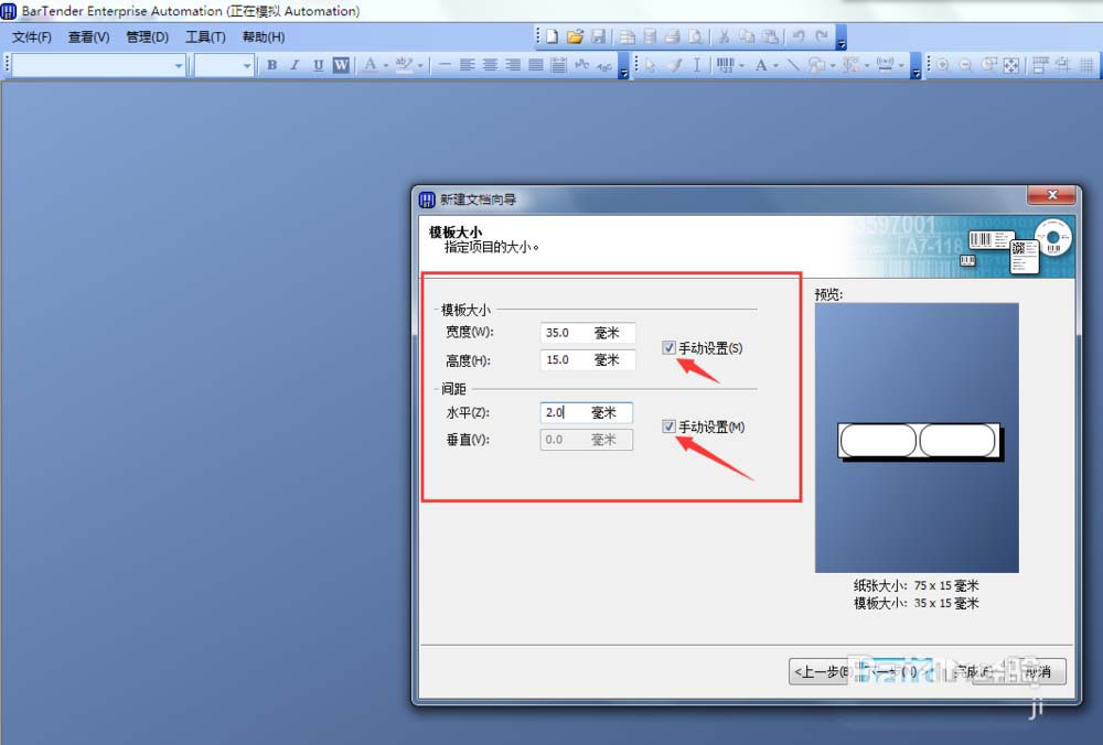 9、在“模版大小”设置页面,勾选“模版大小”和“间距”右边的两个“手动设置”选项,并将宽度设置为35毫米,高度设置为15毫米,水平间距设置为2毫米。点击下一步,进入“打印顺序”页面。