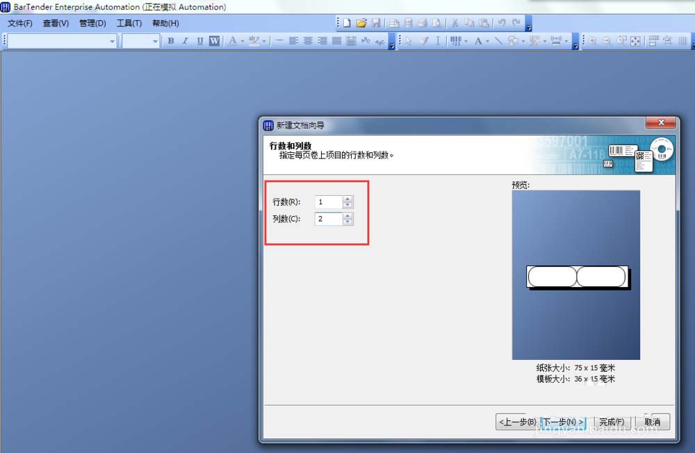 8、在“行数和列数”页面,将行数设置为1,将列数设置为2。点击下一步,进入“模版大小”设置页面。