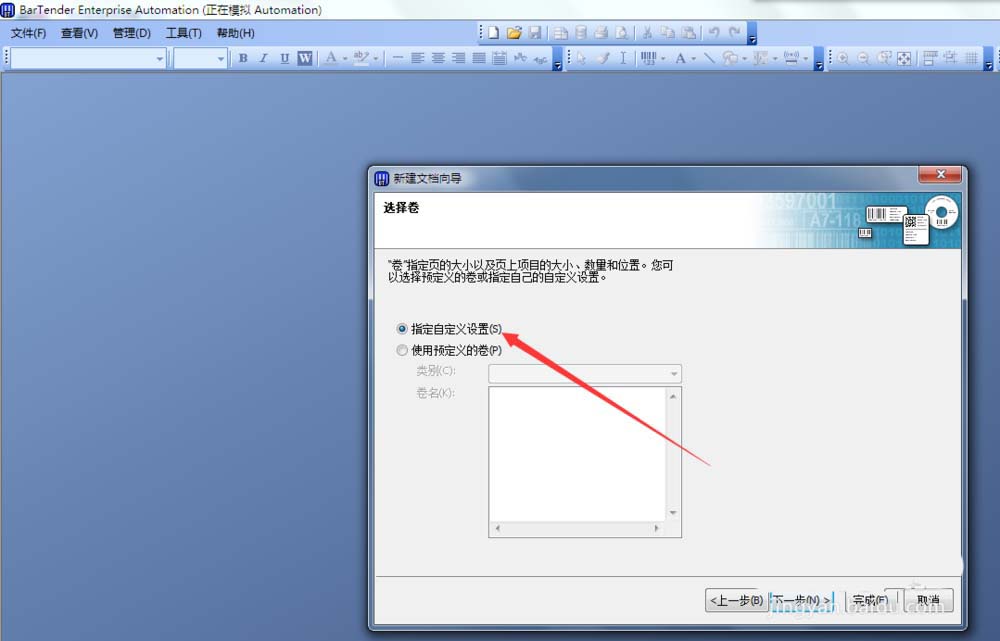 4、在“选择卷”页面,选择“指定自定义设置”,并点击下一步,进入“纸张大小”设置页面。