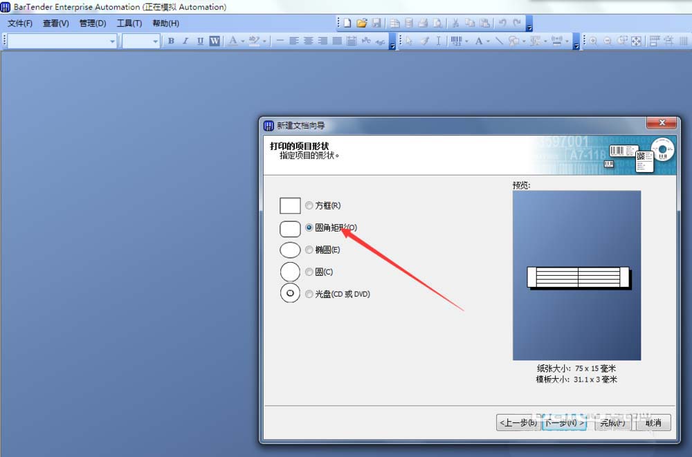 6、在“打印的项目形状页面”,根据标签形状选择,由于我的标签是带圆角的长方形,所以这里我们选择圆角矩形。点击下一步,进入“边距”设置页面。