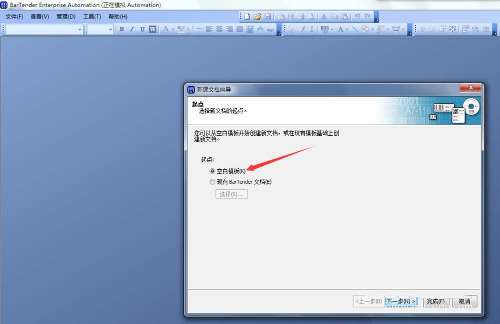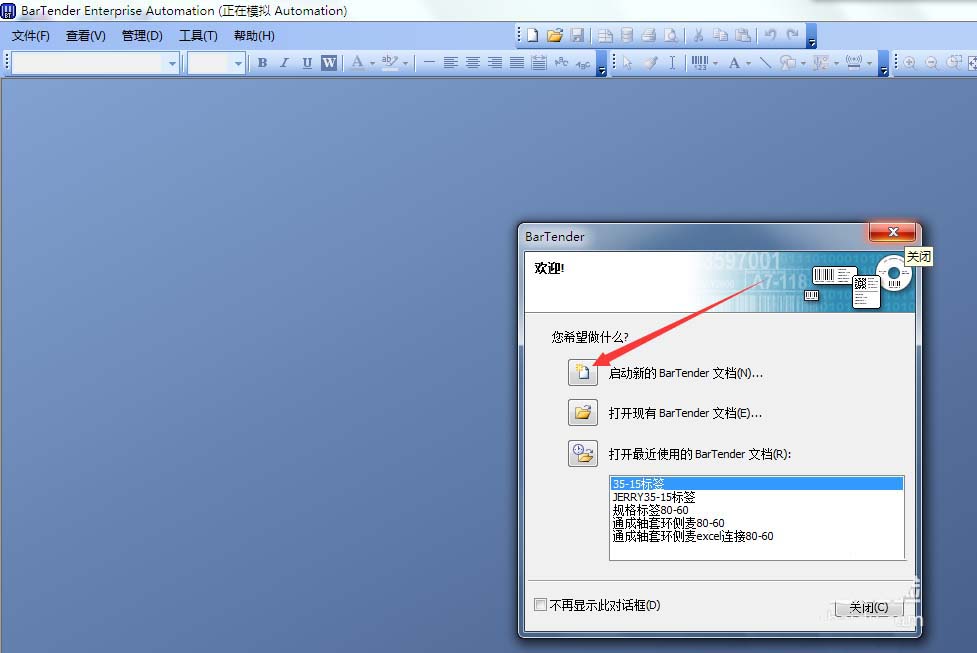 1、打开BarTender软件,并在欢迎对话框上点击选择“启动新的BarTender文档”,如果没有欢迎对话框的话,可以点击菜单栏的“文件--新建”,打开“新建文档向导”对话框。