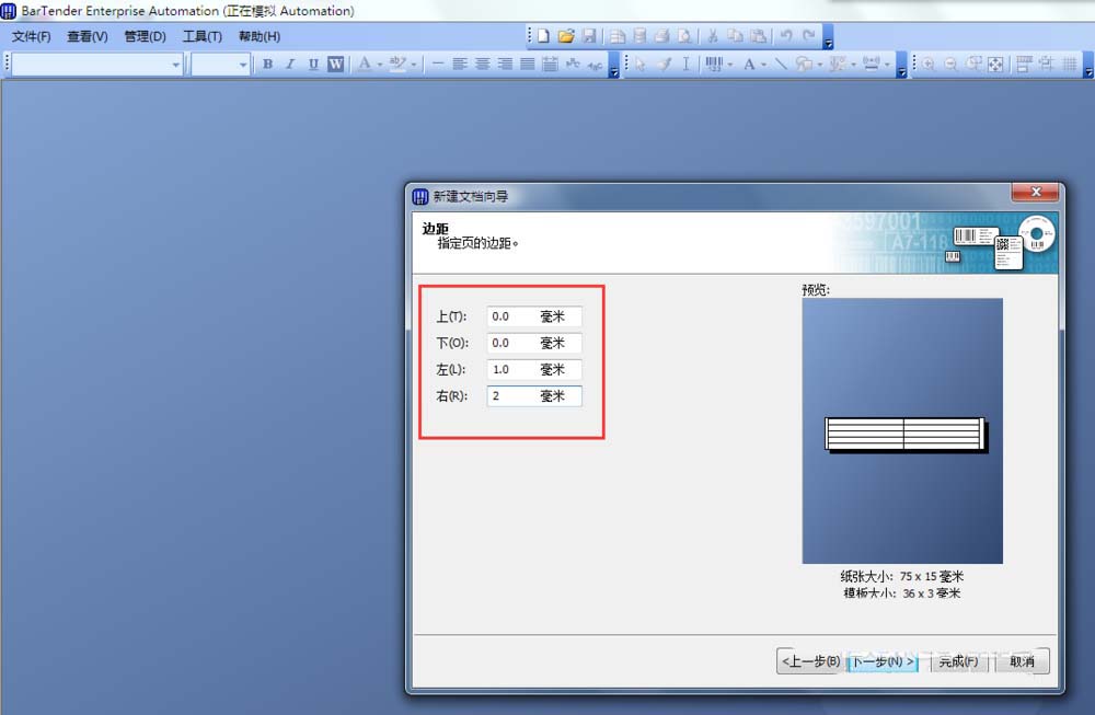 7、在“边距”设置页面中,我们将“上”和“下”都设置为0.0毫米,根据测量结果将“左”设置为1.0毫米,将“右”设置为2毫米,如图。点击下一步,进入“行数和列数”设置页面。