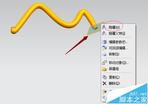8、点击平面和草图成橘黄色状态,然后右击右键,选择隐藏,将平面和草图图形进行隐藏