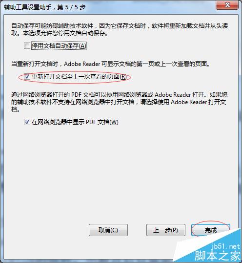 6、勾选重新打开文档至上一次查看的页面,单击完成,设置结束