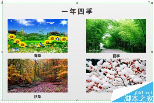 4、为了区分四幅图像的不同主题,分别在图像下方加上标题,为春季、夏季、秋季和冬季,并将图形的大标题改为”一年四季“,如下图所示: