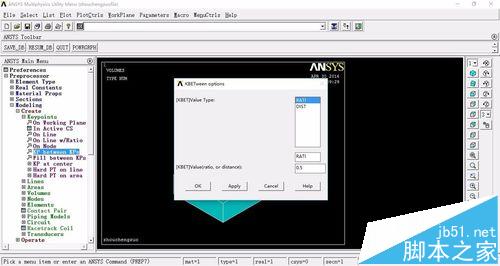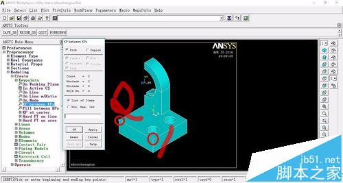 3、创建点,如下图所示。再创建四分之一的实心圆柱体,Main Menu>Preprocessor>modleing>create>volumes>cylinder>partial cylinder,输入坐标位置、内外半径的大小以及起始角和终止角。