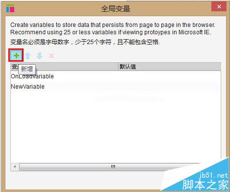3、、新增变量点击“主菜单栏”-“工程”-“全局变量”,打开“全局变量”窗口,点击“+”号,新增新变量。